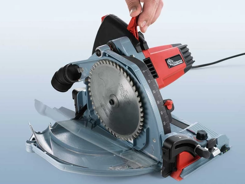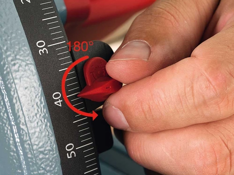 - De zaagdiepte kan op de mm nauwkeurig ingesteld worden. Met of zonder geleidingsliniaal – eenvoudig de aanwijzer verdraaien en de exacte zaagdiepte wordt aangegeven.